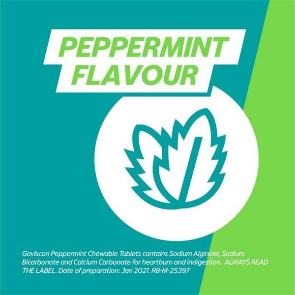 Gaviscon Peppermint Chewable Tablets relieve the discomfort of heartburn and acid indigestion by creating a protective lay over the contents of the stomach. This preventive layer acts as a barrier stopping the acid in the stomach from escaping.