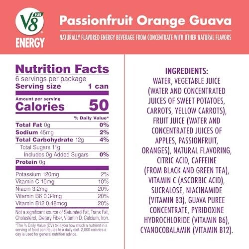 The V8 +Energy Passionfruit Orange Guava Juice Energy Drink delivers a vibrant tropical flavor blend of passionfruit, orange, and guava combined with the goodness of fruit and vegetable juices. Powered by natural caffeine from tea, it provides a smooth and steady energy boost without the harsh crash of traditional energy drinks.