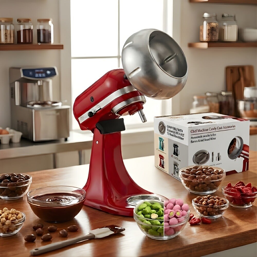 Create professional-quality chocolate-covered snacks at home with this Snack Coater Attachment compatible with KitchenAid Tilt-Head Stand Mixers. Perfect for coating almonds, pistachios, peanuts, macadamia nuts, raisins, blueberries, and freeze-dried strawberries, this accessory transforms your stand mixer into a gourmet snack-making machine.