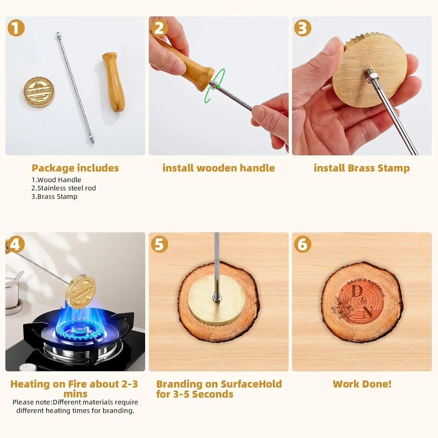 The sturdy handle provides a comfortable grip and safe application. Simply heat the brass stamp and press firmly onto your product surface for a crisp, professional mark.